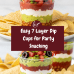 These 7 Layer Dip Cups are a fun and delicious party appetizer featuring layers of refried beans, taco seasoning, guacamole, sour cream, salsa, cheese, tomatoes, green onions, and olives. Served with tortilla chips, they make the perfect handheld snack for gatherings or game day.