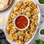 - Serve: Transfer the air-fried tortellini to a serving dish. Sprinkle with the remaining ¼ cup of grated parmesan and chopped fresh parsley. Serve immediately.