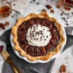 Ari’s Foolproof Chocolate Bourbon Pecan Pie combines the rich, nutty flavor of pecans with the smooth sweetness of bourbon and chocolate chips in a buttery homemade pie crust. Topped with a delicate cinnamon-spiced whipped cream, this decadent dessert is perfect for special occasions or comforting gatherings.