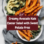 This Avocado Kale Caesar Salad combines creamy avocado dressing with hearty kale leaves for a fresh twist on a classic. Paired with sweet potato fries, it makes a satisfying and nutritious meal perfect for any day of the week.