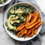 This Avocado Kale Caesar Salad combines creamy avocado dressing with hearty kale leaves for a fresh twist on a classic. Paired with sweet potato fries, it makes a satisfying and nutritious meal perfect for any day of the week.