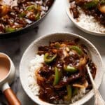 The image shows a bowl filled with a layer of white rice at the bottom and topped with a thick, glossy dark brown sauce mixed with pieces of green bell peppers, caramelized onions, and slices of beef. The bowl is white and textured with a spoon resting inside it. Nearby, there is another white bowl with more of the same dish and a small white cup filled with a pale pink liquid. The background surface is a white marbled texture, and part of a black pan with a wooden handle containing more of the dish is visible in the lower left corner. photo taken with an iphone --ar 4:5 --v 7