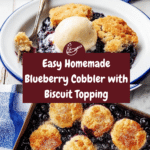 This Blueberry Cobbler features a tender biscuit topping made with a mix of all-purpose and whole wheat flours, grated cold butter, and creamy coconut milk, baked atop a luscious, juicy blueberry filling flavored with lemon juice and vanilla. Finished with a sprinkle of coarse sugar and served warm with vanilla ice cream, it’s a delightful dessert perfect for showcasing fresh summer berries.
