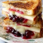 A delightful Brie, Apple and Cranberry Grilled Cheese sandwich that perfectly balances creamy Brie cheese, crisp honeycrisp apple slices, and tangy whole berry cranberry sauce, all toasted between buttery sourdough bread slices brushed with Sauvignon Blanc for a sophisticated twist.