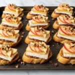 - Assemble the crostini: Remove the crostini from the oven carefully. Top each with a few apple slices, then sprinkle chopped candied pecans evenly over the top.