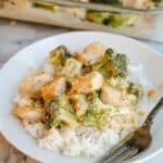 A white plate holds a serving of white rice as the bottom layer, topped with a creamy chicken and broccoli mixture as the second layer. The chicken pieces are light golden brown with a soft texture, and the broccoli florets are vibrant green with a slightly soft texture from the sauce. The creamy sauce is light beige with black pepper specks and some golden crumbs on top of the chicken. A silver fork rests on the right side of the plate. The plate sits on a white marbled surface with a glass baking dish of the same chicken and broccoli mix blurred in the background. Photo taken with an iphone --ar 4:5 --v 7