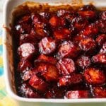 Keywords: Candied Kielbasa, baked kielbasa, sweet kielbasa, kielbasa recipe, holiday appetizer, sausage with brown sugar glaze