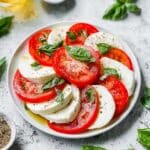 It’s best to assemble Caprese Salad shortly before serving to keep the ingredients fresh and prevent the tomatoes from releasing too much water. If necessary, you can slice the ingredients ahead and assemble just before serving.