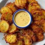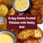 Cheese Crusted Potatoes feature tender yukon gold potatoes coated with aged manchego cheese and seasoned with smoked paprika and seasoned salt, baked to golden perfection. Served with a creamy chipotle garlic aioli made by roasting garlic and emulsifying it with olive oil, egg, and spices, this recipe offers a rich and flavorful side dish or appetizer bursting with smoky and tangy notes.