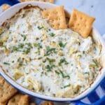 Keywords: Cheesy Artichoke Dip, appetizer, party dip, caramelized onion dip, baked dip, creamy dip