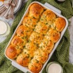 A white rectangular baking dish filled with sixteen golden-brown baked rolls, each topped with melted cheese and sprinkled with chopped green herbs. The rolls are arranged in four rows and four columns, showing a crispy and slightly shiny texture with some browned spots. The dish sits on a white marbled surface, surrounded by a green quilted cloth and a green checkered towel. Nearby, there is a white plate with three forks and two glasses filled with a frothy white drink. photo taken with an iphone --ar 4:5 --v 7