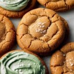 The image shows close-up of several round cookies with cracked golden brown tops stacked closely together on a white marbled surface. The cookies have textured, chewy centers with slightly crisp outer edges. One cookie in the bottom foreground is covered with creamy, smooth green frosting spread evenly with a swirled pattern, topped with small white sugar sprinkles. Some cookies are sprinkled with coarse white salt flakes, adding a bit of contrast to their warm tones. The cookies are thick with depth visible from the top. photo taken with an iphone --ar 4:5 --v 7