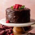 11. Finish Cake with Ganache: Pour or spoon thickened ganache on chilled crumb-coated cake. Smooth over top and sides. Garnish with fresh raspberries and mint if desired. Serve immediately or chill uncovered up to 4–6 hours.