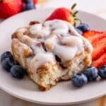 The image shows a white plate on a white marbled surface holding two square cinnamon roll pieces topped with a thick layer of white icing that drips slightly down the sides. The rolls have a swirled, golden brown texture with visible cinnamon streaks. Around the rolls, there are fresh blueberries and sliced strawberries, adding bright blue and red colors. One corner of the cinnamon roll has a bite taken out, showing a soft, fluffy inside with a light beige color. Photo taken with an iphone --ar 4:5 --v 7