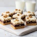 - Add Toppings: Evenly sprinkle the chopped walnuts, semi-sweet chocolate morsels, and flaked coconut over the prepared crust to ensure every bar will have a balanced flavor and texture.