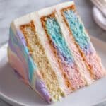 This Cotton Candy Cake features fluffy, vibrantly colored layers infused with a whimsical cotton candy flavor. The moist blue and pink cake layers are complemented by a rich, creamy cotton candy buttercream frosting, layered and decorated with a watercolor finish and topped with soft cotton candy for a magical, fun dessert perfect for celebrations.