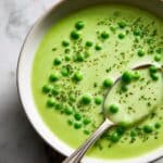 A bowl with a black and white pattern holds a creamy green soup filled with many bright green peas. The soup is thick and smooth, with scattered small bits of green herbs on top. A silver spoon is dipped into the soup, resting on the right side inside the bowl. The bowl is placed on a white marbled surface with a gray dish towel partially visible underneath. Photo taken with an iphone --ar 4:5 --v 7