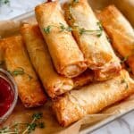 These Crispy Baked Feta Rolls feature flaky phyllo dough stuffed with a flavorful blend of feta cheese, fresh herbs, garlic, and honey. Baked to golden perfection and served with a tangy sweet chili dipping sauce, they make an irresistible appetizer or snack that’s both savory and slightly sweet.