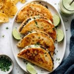 Corn tortillas work well if you prefer a gluten-free option. Be sure to warm them beforehand so they don’t crack when folded and fried.