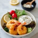 This Fried Shrimp recipe delivers crispy, golden-brown shrimp coated in a light and flavorful batter. Perfect as a tasty appetizer or main dish, the shrimp are deep-fried to perfection and served alongside fresh green salad leaves, cherry tomatoes, wedges of lemon, and tangy tartar sauce, creating a delightful balance of textures and flavors.