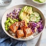6. Assemble the Bowls: Place a portion of the ginger scallion rice at the bottom of each serving bowl. Top with crispy teriyaki salmon bites, cooked edamame, sliced cucumber, shredded purple cabbage, and avocado slices. Drizzle the sriracha mayo over the top and sprinkle with sesame seeds if desired. Serve immediately for the best flavor and texture.