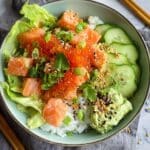 Keywords: salmon bowl, sushi bowl, crunchy salmon roll, no-roll sushi, Japanese cuisine, home sushi recipe, fresh salmon recipe