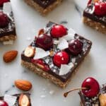 These Dark Chocolate Cherry Coconut Almond Oat Bars are a deliciously wholesome snack packed with old fashioned oats, raw almonds, coconut flakes, and dried cherries, all bound together with almond butter and honey. Topped with a smooth layer of 72% dark chocolate and decorated with fresh cherries, flaked coconut, chopped almonds, and a sprinkle of flaky sea salt, these bars offer a perfect balance of sweet, nutty, and tart flavors. They are easy to prepare with no baking required, making them a great treat for quick energy and satisfying cravings.