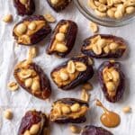 - Fill the dates: Spoon approximately ½ tablespoon of peanut butter into the cavity of each pitted date. Top the peanut butter with several roasted peanuts to add crunch. Arrange the stuffed dates on the parchment-lined plate or baking sheet and place them in the freezer until firm and completely solid, at least one hour.