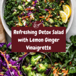 A vibrant and nutrient-packed Detox Salad featuring kale, broccoli, red cabbage, and spinach, tossed with a zesty lemon ginger vinaigrette. This salad combines crunchy vegetables, nuts, and seeds with a tangy dressing packed with fresh ginger, lemon, and a hint of honey for a refreshing and cleansing dish.