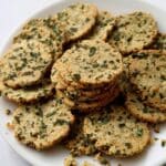 A pile of round, flat green herb crackers sits on a white plate with a few crumbs scattered around. The crackers are light brown with dark green bits of herbs spread evenly through each one. They have a rough, crumbly texture and are stacked in layers that create a small mound in the center of the plate. The background is a white marbled surface. photo taken with an iphone --ar 4:5 --v 7