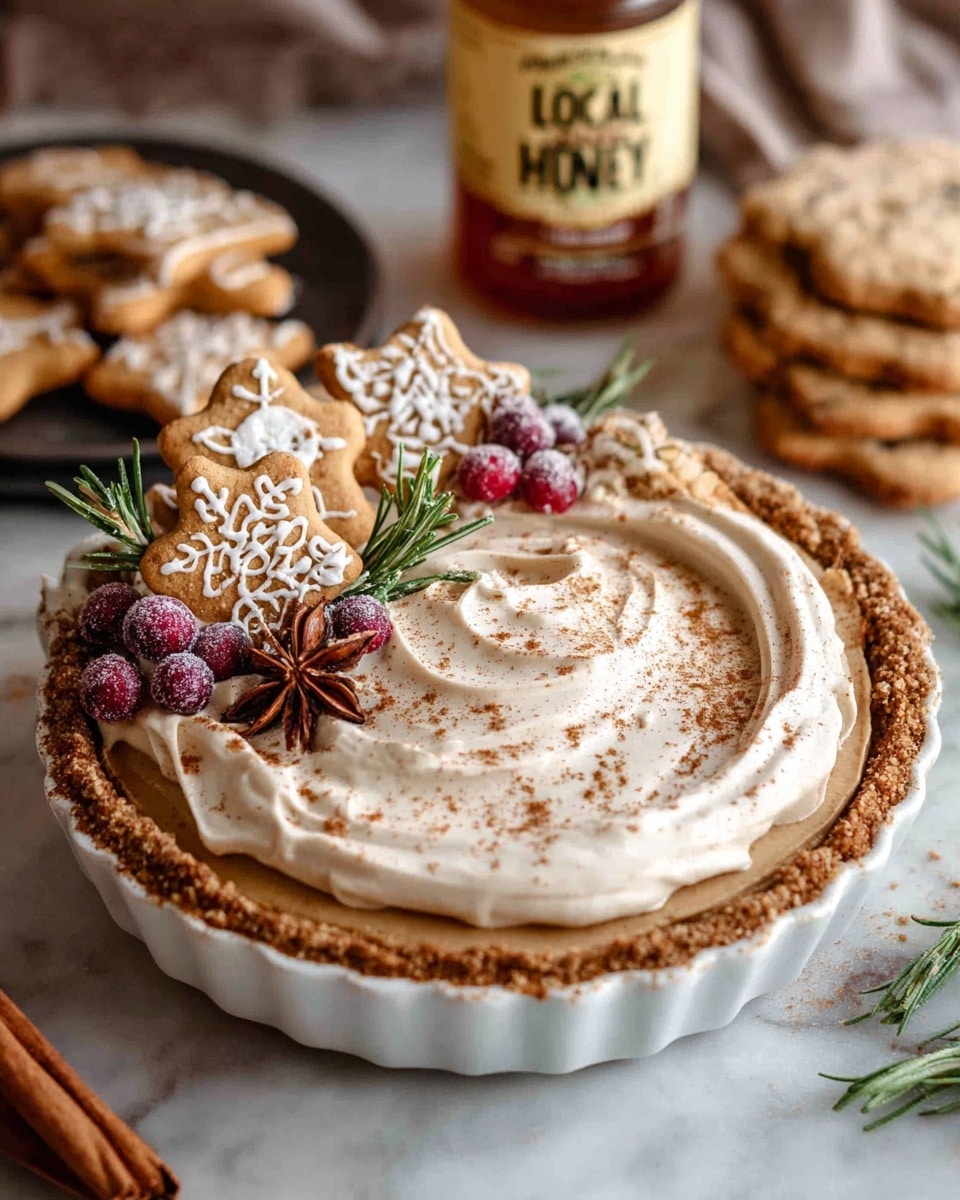 5. Garnishing and Serving: Just before serving, spread the reserved whipped cream over the pie. Decorate the top with the gingerbread cookies, sugared cranberries, fresh rosemary sprig, and star anise pieces for a festive touch. Serve chilled and enjoy!