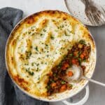 Store leftover shepherd’s pie covered in the refrigerator for up to 3 days. Reheat individual portions in the microwave or warm the entire dish in a 350°F (175°C) oven until heated through. Shepherd’s pie also freezes well; thaw overnight in the fridge before reheating.