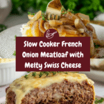 Keywords: French onion meatloaf, slow cooker meatloaf, caramelized onion meatloaf, Swiss cheese meatloaf, comfort food, easy meatloaf recipe