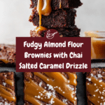 Keywords: fudgy almond flour brownies, chai salted caramel, gluten free brownies, almond flour dessert, rich chocolate brownies, homemade salted caramel, chai spice caramel drizzle