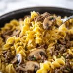 Keywords: Ground beef stroganoff, beef stroganoff, creamy beef pasta, comfort food, easy dinner, one skillet meals