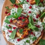 Keywords: halloumi flatbread, hot honey halloumi, Mediterranean flatbread, homemade flatbread, mint yoghurt sauce, pomegranate seeds, sweet and spicy halloumi