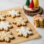 The image shows several snowflake-shaped cookies placed on a sheet of brown parchment paper over a white marbled surface. The cookies have a golden-brown color with slightly darker edges. Some of the cookies are decorated with white icing in a snowflake pattern, creating a smooth and glossy texture on top. Other cookies have a sparkling coarse sugar topping that adds a glittery effect. On the right side, a stack of cookies tied with red and white twine is visible, while in the background, small green, red, and yellow miniature Christmas trees sit on two round, stacked wooden slices adding a festive touch. photo taken with an iphone --ar 4:5 --v 7