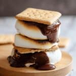 Indoor s’mores are best enjoyed fresh and warm. If needed, store leftovers in an airtight container at room temperature for up to one day. Reheat gently in the air fryer for 10-15 seconds to soften the chocolate and marshmallow again.