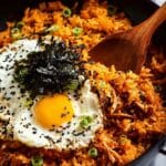 - Serve: Plate the kimchi fried rice and top with a sunny-side-up fried egg with a runny yolk. Garnish with black sesame seeds, finely sliced green onions, and crispy seaweed strips to add texture and flavor.