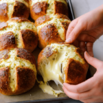 7. Dip Buns in Garlic Butter Sauce: Dip each cream cheese-stuffed bun gently into the garlic butter sauce to coat them well on all sides. Then place them onto a baking tray lined with baking paper.