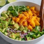 A vibrant and refreshing Mango Salad with Sweet Chilli Lime Dressing, featuring ripe mangoes, creamy avocado, crisp cucumber, and a zesty, slightly spicy dressing topped with crunchy peanuts. Perfect as a light lunch or a colorful side dish.