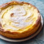 A round cheesecake with a thick, golden brown crust forms the base and edges. The top layer is creamy and smooth, pale yellow in color, with gentle swirls and soft peaks. A light dusting of white powdered sugar is spread unevenly across the surface, adding a delicate touch. The cheesecake is placed on a white plate with a dark rim, set on a white marbled textured surface. photo taken with an iphone --ar 4:5 --v 7