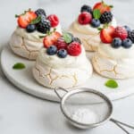 Light and airy mini pavlovas featuring a crispy meringue shell with a soft marshmallowy center, topped with stabilized whipped cream and a vibrant mix of fresh fruits including strawberries, mangoes, blueberries, raspberries, kiwi, and passionfruit. Perfectly sized for individual servings, these elegant desserts are baked low and slow for the ideal texture and finished with a dusting of powdered sugar and mint sprigs for freshness.