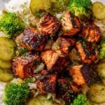 4. Build the salmon rice bowls & serve: Arrange cooked rice and broccoli florets in shallow bowls. Top with the seared salmon cubes. Garnish with pickled cucumbers or other pickled vegetables, avocado slices, corn, fresh chopped herbs, and sesame seeds as desired. Drizzle with the reserved miso ginger soy sauce. Serve immediately and enjoy your flavorful salmon rice bowls!