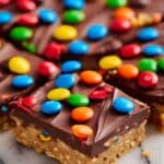 - Spread Chocolate and Add Toppings: Pour the melted chocolate over the pressed cookie base and smooth it out evenly. Sprinkle the remaining 2 tablespoons of miniature M&M’s on top for added texture and decoration.