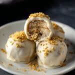 Store the pumpkin cheesecake balls in an airtight container in the refrigerator for up to 5 days. To enjoy, let them sit at room temperature for about 10 minutes for a softer texture. They do not freeze well once coated, as the texture may change.