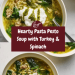 This hearty Pasta Pesto Soup with Turkey and Spinach is a comforting and flavorful one-pot meal that combines the freshness of pesto, tender ground turkey, nutritious spinach, and delicate orzo pasta. Perfect for a cozy lunch or dinner, this recipe is simple to prepare and offers a balanced blend of protein, greens, and carbs in a savory broth accented with a touch of lemon and optional creamy ricotta.