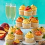Keywords: Peach Bellini Cupcakes, champagne cupcakes, peach cupcakes, champagne pastry cream, peach buttercream, festive cupcakes, cocktail-inspired dessert