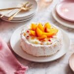 The image shows a round pavlova dessert on a white plate, placed on a white marbled surface. The pavlova has two visible layers: a base layer of crisp white meringue with a rough, crackled texture, and a thick layer of smooth white whipped cream spread on top. Mixed into the whipped cream are small pieces of red and orange fruit. Three large bright orange peach slices sit neatly in the center, adding a fresh and colorful touch. Next to the plate is a soft peach-colored cloth napkin and an empty white plate. Two gold forks rest on a small white plate nearby, with a glass of a light pink drink above it. Photo taken with an iphone --ar 4:5 --v 7