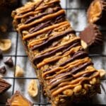 These Peanut Butter Cup Granola Bars combine wholesome oats, crunchy peanuts, and creamy peanut butter with sweet honey and a hint of molasses for a delightful snack. Topped with mini peanut butter cups and a drizzle of melted chocolate and peanut butter, these bars are perfect for a quick energy boost or a satisfying treat. Made without baking, they come together quickly on the stovetop and set in the freezer or fridge for a no-bake, deliciously chewy bar.
